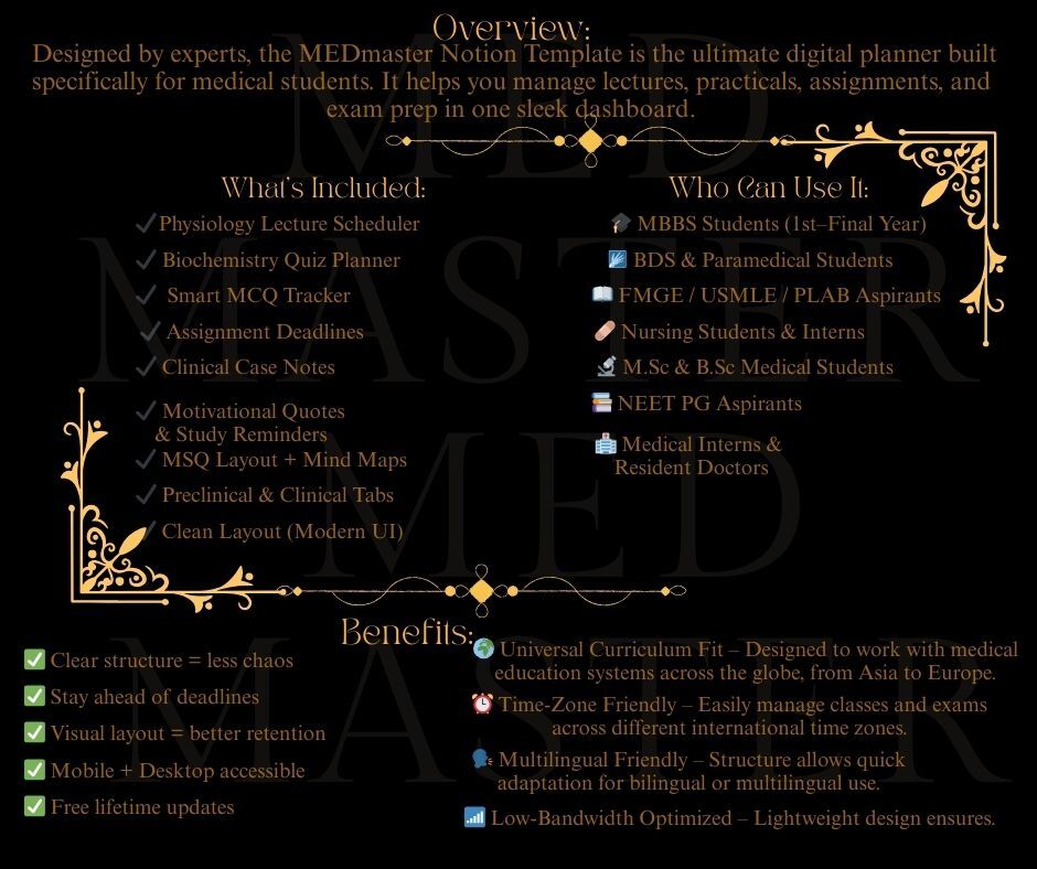 Credibility & Community: MedMaster is not just another template; it’s quickly becoming a must-have tool in the med student community. Created by Notion experts in collaboration with high-achieving medical students, it encapsulates best practices that have been tested in real med school trenches. Join thousands of other students worldwide who are using MedMaster to transform their study habits. Many say, “I feel like a top student now – and my grades show it,” after using this system. The name MedMaster is earning a reputation as the go-to planner for serious med scholars – you can trust you’re in good company.