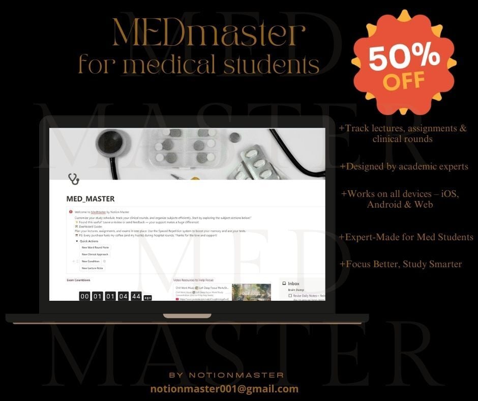 Meet MedMaster – the planner that’s as ambitious as you are. This all-in-one Notion template is like your Medical School Operating System, running every aspect of your academic life. It’s a Study Planner and Organizer combined, engineered to help you learn more in less time and keep your med school world perfectly ordered. If you’ve been overwhelmed by juggling classes, study schedules, exams, and your personal life, MedMaster is the game-changer you’ve been waiting for.