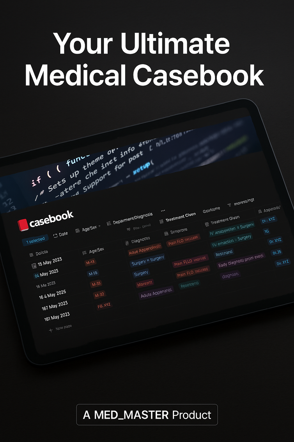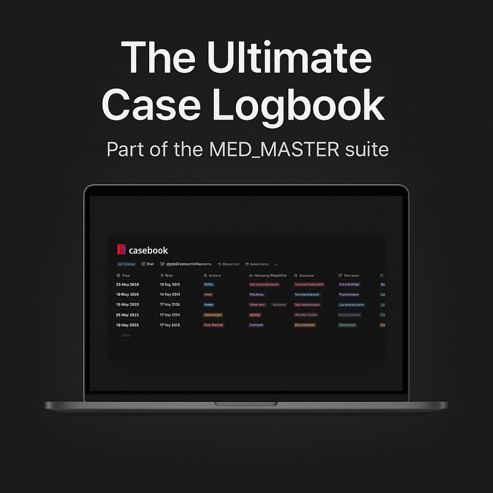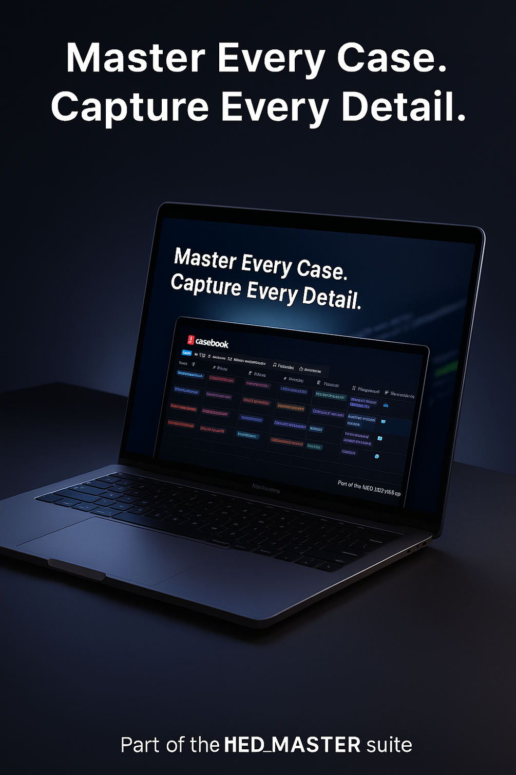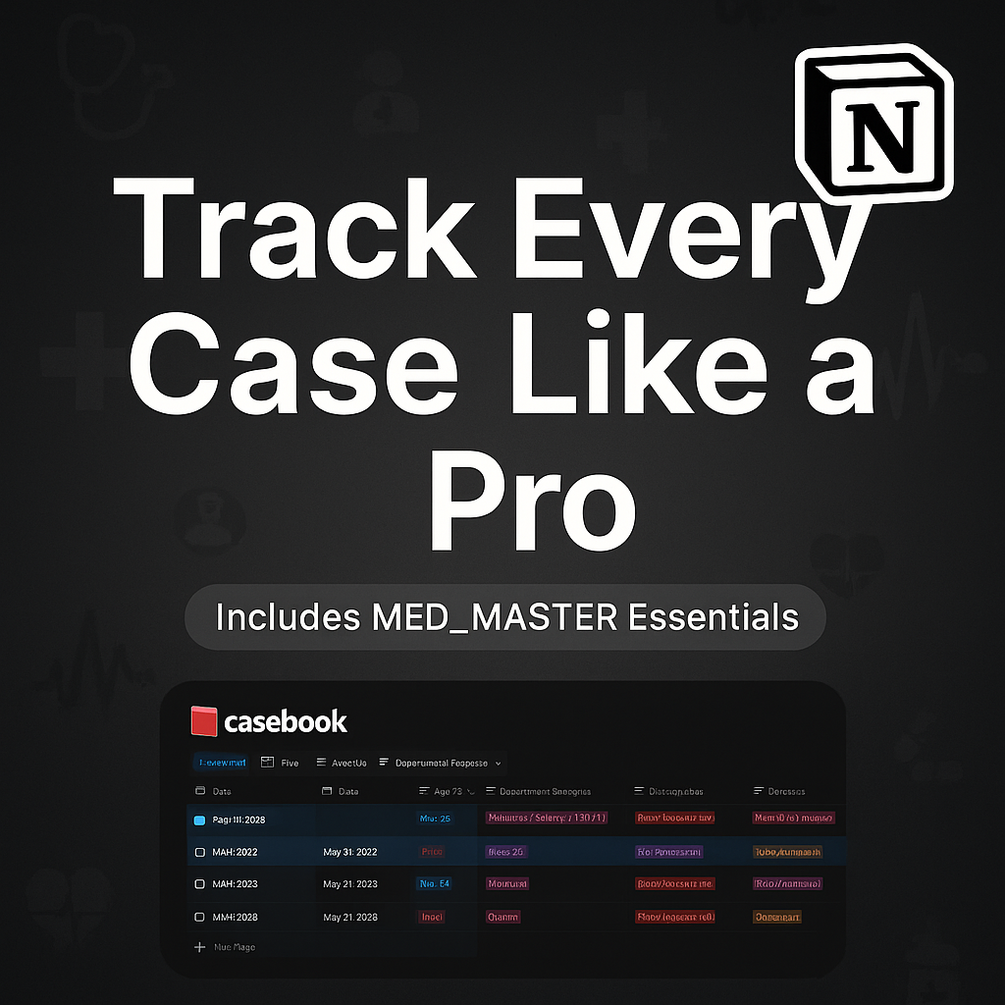 Professional Notion Casebook to log, track, and reflect on patient cases with confidence. A core part of the MED_MASTER system—simplify your rotations and stay exam-ready anywhere.